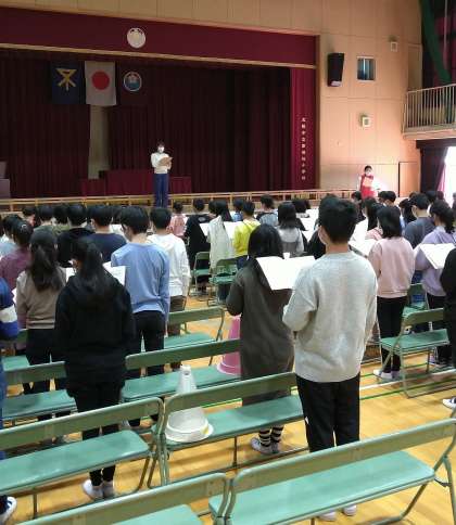 きょう5年生のみなさんが設営してくれた講堂の会場で、6年生は卒業式の学年全体練習を始めました。