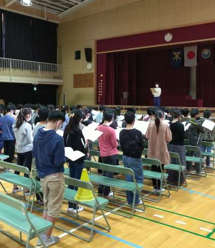 これまで各学級で合唱の練習をし、呼びかけの言葉や決意の言葉を考えるなど準備をしてきました。きょうは初めての全体練習で、講堂内での動きや距離感、声の大きさや起立・礼・着席など所作の確認など、慣れない練習が続いたのでいささか疲れたかもしれませんが、卒業式まで登校できる日数は実質2週間分です。