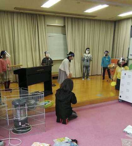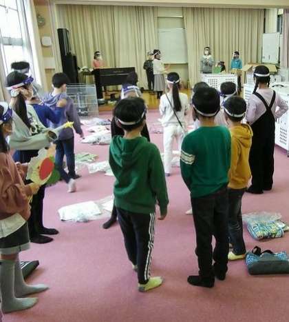 他の班は、舞台の友だちの動きに合わせて待機場所で班別練習です。
