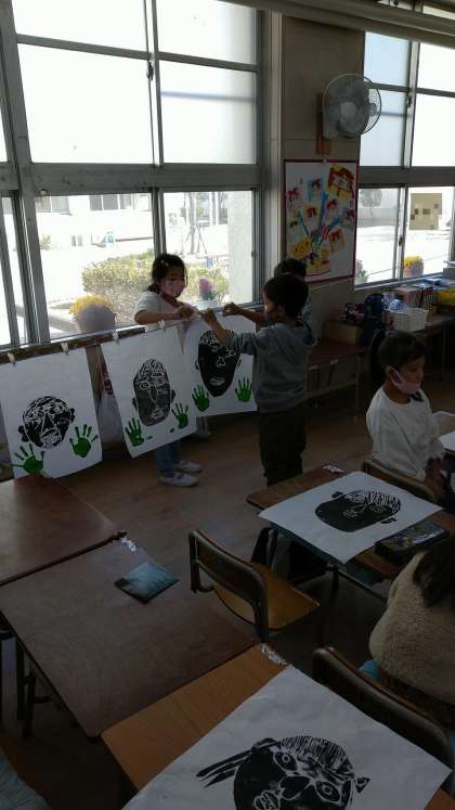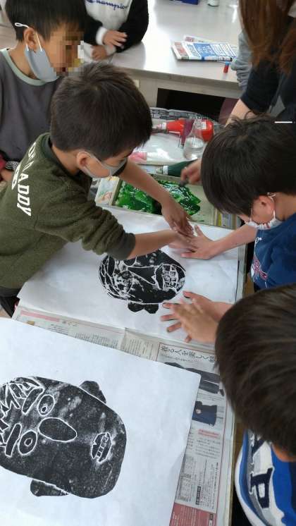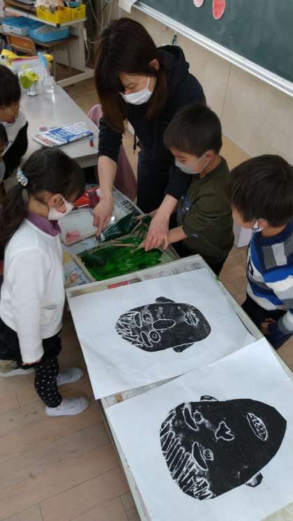 5時間目、乾燥したあとの自画像版画に「手形」を入れていました。