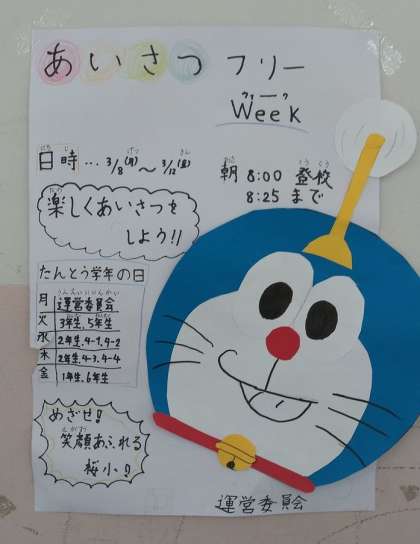 運営委員会が全児童にアンケートをとって考え出されました。朝のあいさつ運動を発展させて、委員以外の事前募集した「有志の児童のみなさんも参加」して行います。