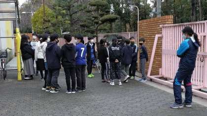 取組直後に、円陣を組んで反省会。声が出せていたか、おしゃべりなどせずまじめに取り組めていたかなど……。