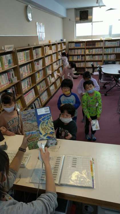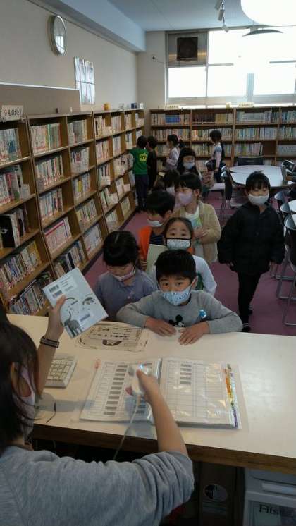 図書の時間に本の返却と貸し出しを行っていました。怖い本を借りた児童から読み聞かせをねだられましたが、自分で読むには少し難しい本を借りてしまったようです。少し読み聞かせを進めていると、どんどん子どもたちが集まってきてしまいました。お家でも呼んでもらうのかな。
