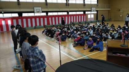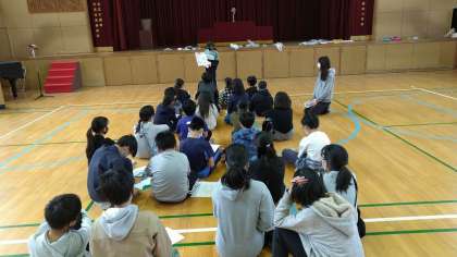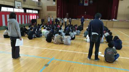 写真は、開会式のようすと最初の取組になる「焼き板細工」について、係が学級毎に説明しているところです。