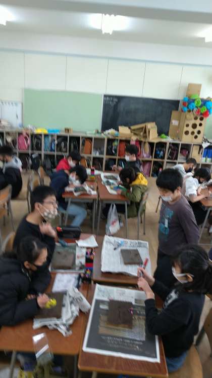 午後の取組のメインは焼き板の絵付けです。この後、中庭で記念撮影です。