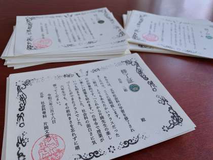 今週は、5年生のみんなに、1年間、社会科を頑張ったことを称え、手作りの修了証が手渡されました。