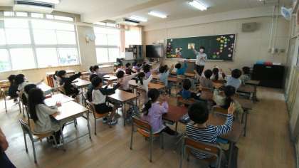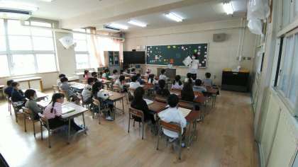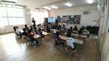 この日は、感染予防のための手洗いのしかたやトイレのことなどを学ぶ保健指導で、養護教諭が一時間づつ各学級をまわりました。
