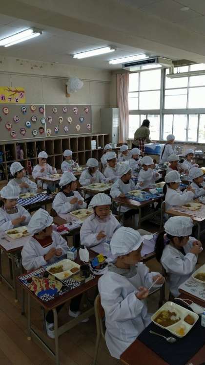小学校生活はじめての給食の献立は、カツカレーライスでした。デザートにフルーツ白玉が添えられました。