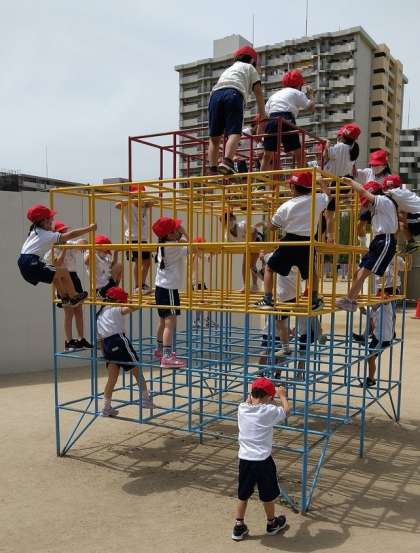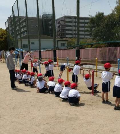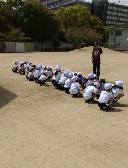 3時間目の体育のようすです。着替え指導の後、保健室の場所の確認や使ってもよいトイレの確認などをしたのち、運動場での活動です。