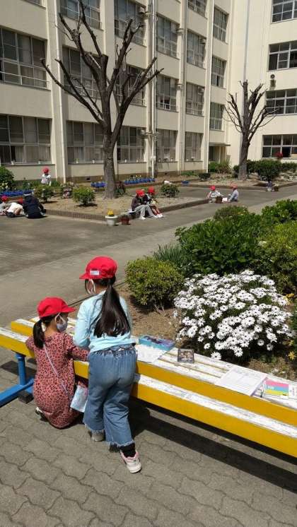 中庭では、2年生が、「春をみつけよう」をめあてにして、花々の観察をしていました。今日はスケッチ日和ですね。