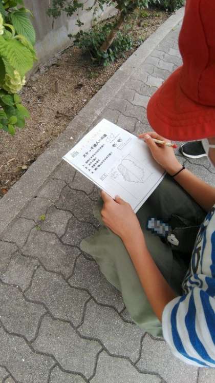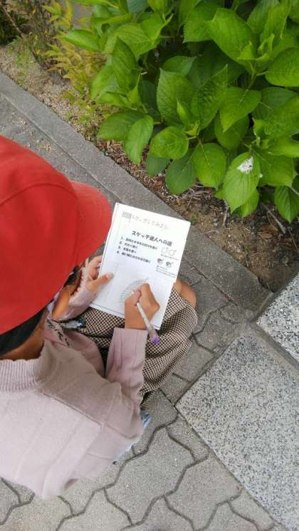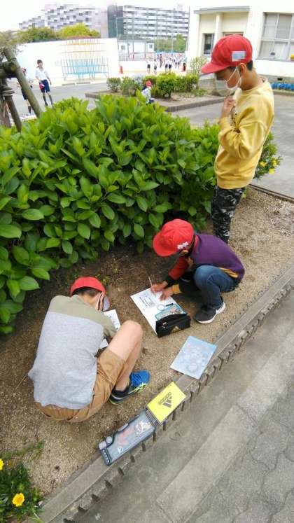 4時間目の中庭では、理科におけるスケッチの基本を実践していました。近づいて観察したり虫眼鏡を使ったりと、みんな意欲的に取り組んでいました。