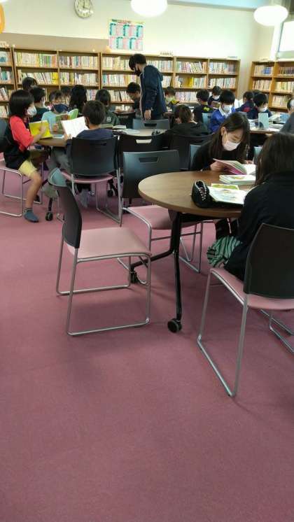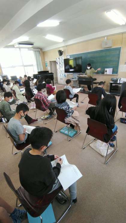 4限目に図書室と音楽室に移動しての授業でした。できるだけソーシャルディスタンスをとるようにして活動しています。