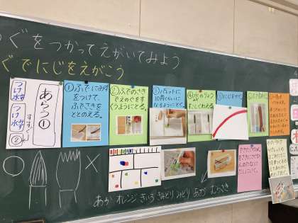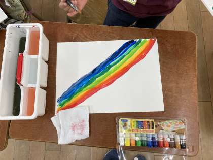 図工の学習で初めて絵の具を使いました。みんなで虹を描き、紫色は、赤色と青色の絵の具を混ぜて自分で色を作りました。
