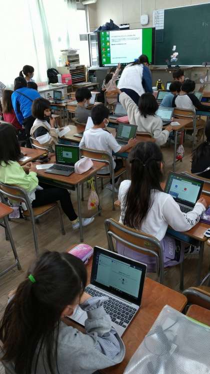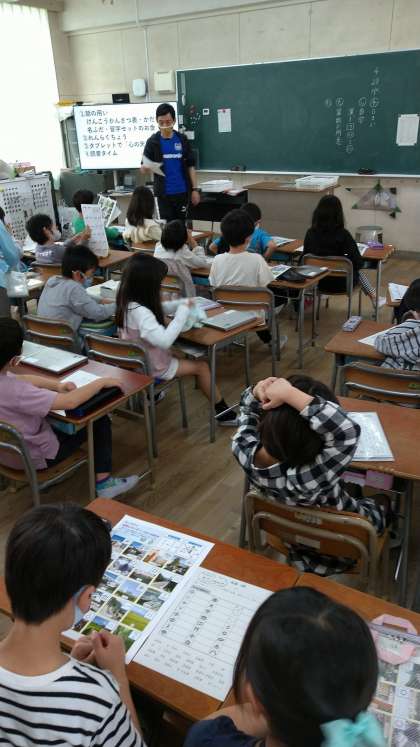 ティームティーチングで、タブレット端末の使い方を指導している学級では、使い方がわからないとき、静かに手を挙げて先生が来てくれるのを待ちます。得意な子が教えてくれるようすもありました。