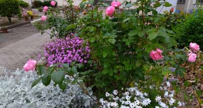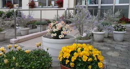 管理作業員さんが丹精を込めて世話したバラをはじめとした花々が中庭を彩っています。子どもたちの五感に働きかけ情操を養います。生活科や理科の観察にも中庭の植物たちは活用されています。