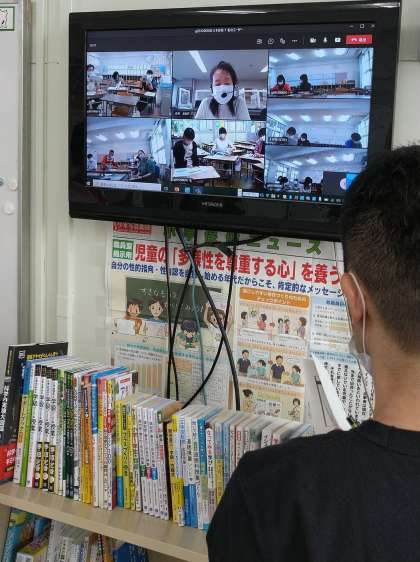 密を避けるためと、学年の取組をしっかりと振り返るため、学年ごとに違う部屋に分散しての研修です。私は、下の写真のように職員室で参加しました。写っている書籍はほんの一部ですが、先生方の自主研修用に配置しています。