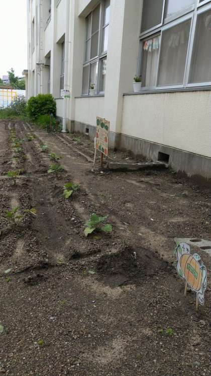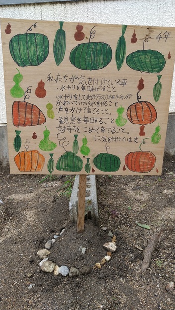 4年生が栽培しています。毎朝、水やりや草抜きをしていますよ。手作りの立て看板に熱意を感じますね。