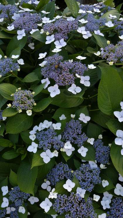 古くからいる教職員は、毎年アジサイを愛でるのを楽しみにしているとのことで、例年より梅雨入りが早かったことが何か影響しないかと心配していましたが、このところの晴天続きのおかげなのかどうかわかりませんが、中庭のガクアジサイは素晴らしく、花には虫が集まってきます。やはり管理作業員が丹精込めて世話をした成果が出ているようです。
