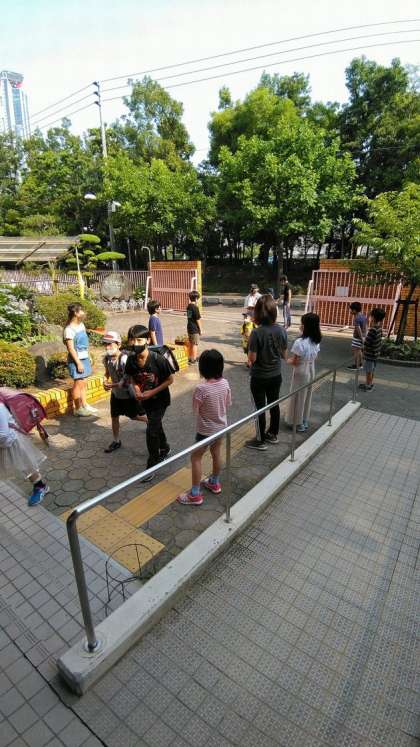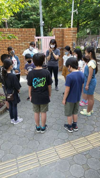 あいさつ運動をよりよくするために、円陣を組んで反省会です。明るい桜小にするため、がんばってください。