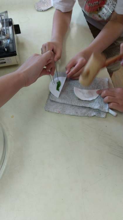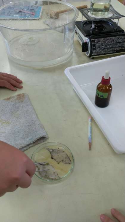 日光の当たっている葉と当たっていない葉で、デンプンがつくられているかどうかを調べる実験をしていたのです。ろ紙を破ってしまわないように慎重に、木槌の重みを利用して丁寧にろ紙全体をたたいて、ろ紙に葉を染め取っています。