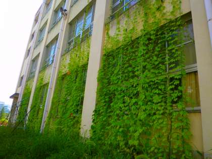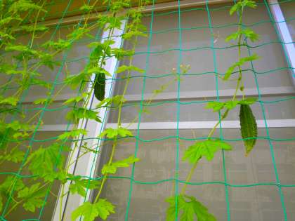 学校では、壁面緑化として中庭にゴーヤを植えています。