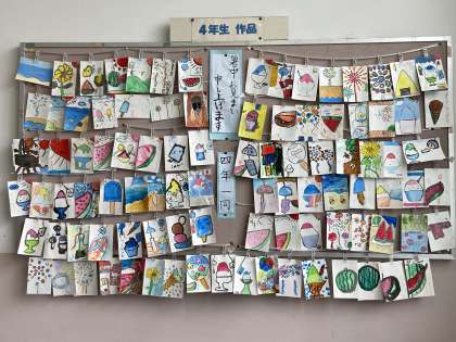 休み時間は、踊り場に掲示しているみんなの作品をじっくり見ている子どもたちの姿があります。