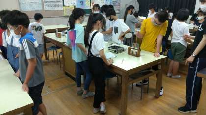 6年生の理科専科授業で、水溶液の実験を行っていました。液性や蒸発させたらどうなるかなど、水溶液の学習内容を確認しながら、5種類の水溶液の性質を調べていました。マスクと保護メガネを着用し、空調機のない理科室で加熱器具を使う実験は暑くて大変ですが、時々廊下に出て涼むなどしながら、がんばっていました。