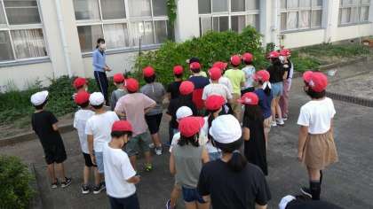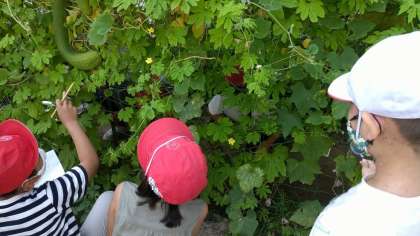 5年の理科専科で、花のつくりのうち、特におしべとめしべに注目して観察していました。とても蒸し暑い午後の中庭でしたが、一人一人虫メガネを手に熱心に取り組んでいました。生い茂った葉の向こう側にも子どもたちはいますが、見えますか。