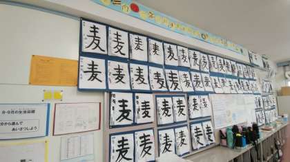 お手本を見て書いた「麦」個性が出ていますね。「麦踏」作業というのがありますが、踏まれることによって倒れにくく、株が太く育つ麦。