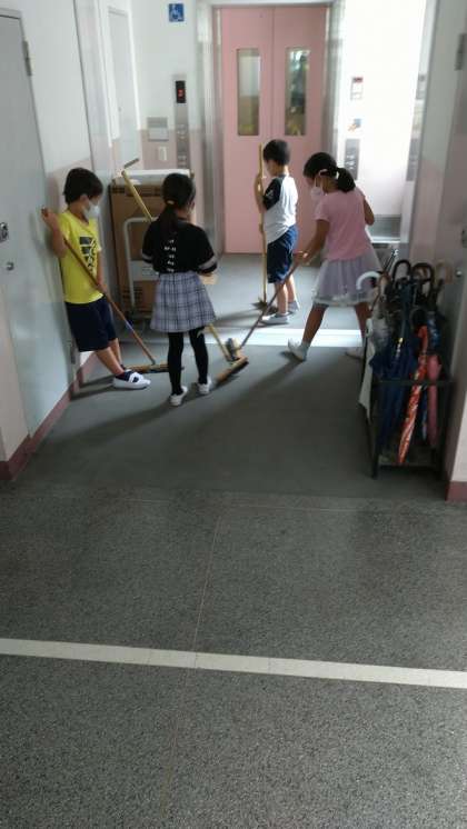 校長室前のエレベーターホールと職員室前廊下は2年生が担当で、自在ぼうきを使うのはコツがいりますが、協力し合ってきれいにしてくれます。給食の後の20分休憩が終わる前には集合して、そうじを始めてくれます。