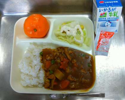 今日は、小麦粉ではなく米粉を使ったカレールウや卵不使用のドレッシングが使われていました。普段との違いが判らないほどおいしく調理されていました。カレーの具のニンジンに、熊(クマ)の形のものを混ぜてくださるなど、児童が話もできずに給食を静かに食べなければならない現状で、少しでも楽しくおいしく好き嫌いなしに食べてほしいとの調理員さんの願いや愛情をいっぱい詰め込んでくださっています。ありがとうございます。