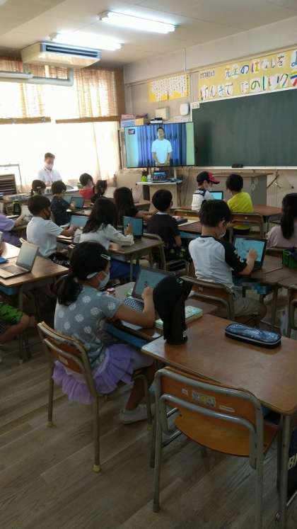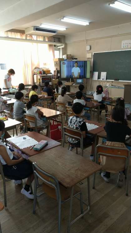 朝夕は、だいぶ涼しくなってきました。全校集会も校庭でじゅうぶん行えますが、緊急事態宣言が解除されていませんので全体集合は避け、今朝も放送集会を行いました。写真は、2年生の教室ですが、しっかり耳を傾けて聞いていました。