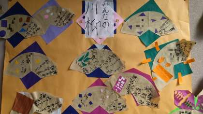 学年内専科授業の書写で川柳をしたためました。五・七・五になっていなくても、なかなか味があると思われませんか。短冊でなく扇を使っているところも。夏休みを題材にしている作品のなかから3つ紹介しましょう。
