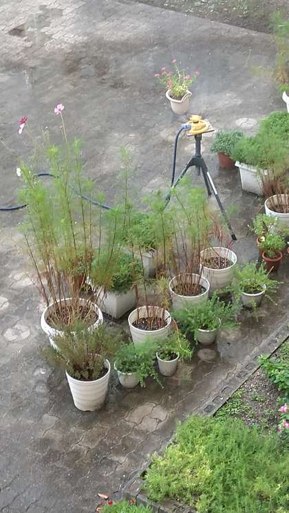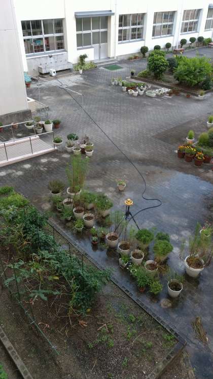 今朝も元気よく回り出しました。管理作業員さんが、翌日の天気や土の湿り具合などに応じて前日にタイマーをセットされます。子どもたちの登校前の土の温度が上がらないうちに朝一番の水やりです。