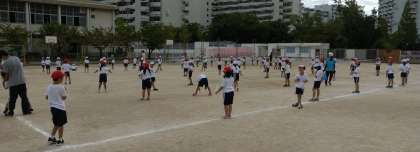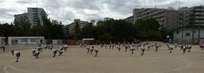 運動場に広がって立ち位置の確認です。きょうは3か所の立ち位置を確認するようです。しっかりと覚えられるかな。まずは、準備運動の屈伸から。