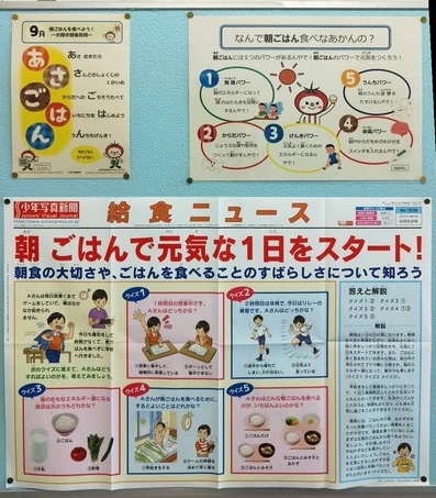 給食室横の掲示板で9月は「大阪市朝食普及月間」(大阪市健康局主催)であることが紹介されていました。詳しくは、住之江区のホームページでも紹介されているので見てください。