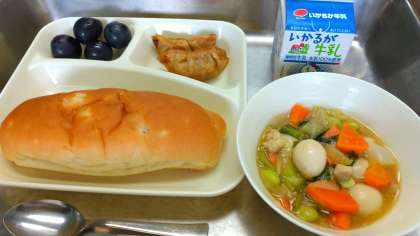 きょうの献立は、あげぎょうざ、中華煮、ぶどう(巨峰)、おさつパンでした。さつまいもなど旬の野菜や果物が食材に使われており、大変おいしくいただきました。