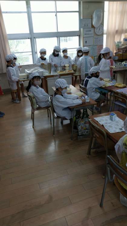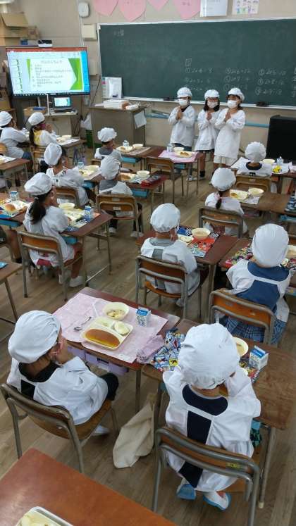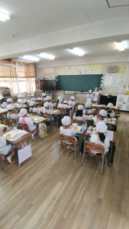きょうの献立は、米粉を使ったコーンクリームシチュー・はくさいのピクルス・りんご・パンプキンパンです。配膳も手際が良くなりました。みんな揃ったら当番の声がけで「いただきます!」