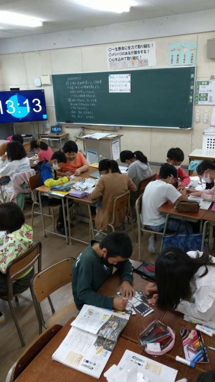 工場での生産ラインについて実感として理解できるように自動車の模型を組み立てる作業を行いました。前時までに一人一人で行ってきた組み立て作業を、今日は班で協力して作業を分担し、流れ作業になるようにして行いました。効率よく組み立てができたのはどちらのやり方でしょうか。