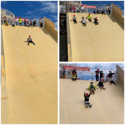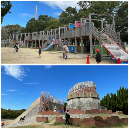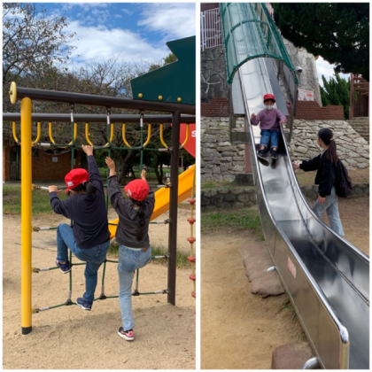 大きな滑り台は『こわい〜、一緒に滑ろう』と友だちと誘い合い、ドキドキしながら滑っています!
