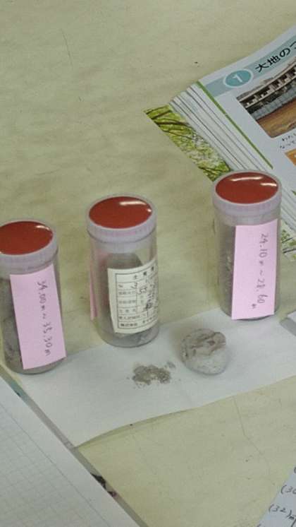 本校建築当時のボーリング調査で採取された試料を観察しました。色や手触り、土の粗さやたい積の厚みなど、わかったことをまとめます。