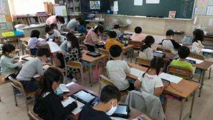 どうぶつに乗った自分の絵を図画工作で描くようです。遠足で行った海遊館の生き物たちを思い出しているかな。タブレットを使って乗りたい動物を調べている学級もありました。楽しそうですね。