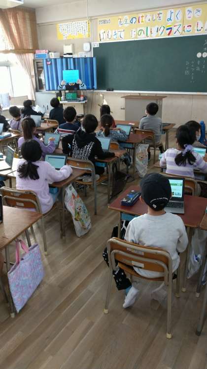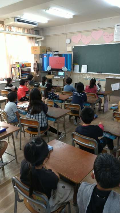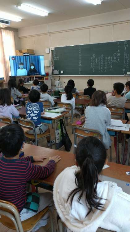 写真は、2年生の教室の様子です。みんな画面にくぎ付けになっていました。