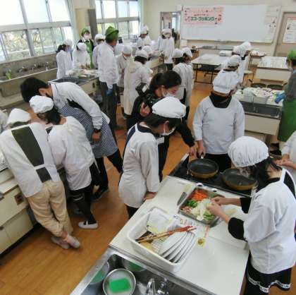 3・4時間目に調理実習をしていました。譲り合ったり助け合ったりして調理を進めることは、エコ・クッキングには不可欠な「思いやり」です。きょうも試食を持ってきてくれました。食材本来の味わいとシャキシャキ感を感じられるような繊細な味付けでおいしかったです。