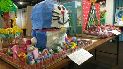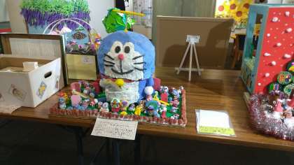 昨年度は、『鬼滅の刃』を題材にした平面作品でしたが、今回は、写真のような楽しい立体作品でした。一人ひとりが考えた「ひみつどうぐ」のアイデア集も添えられていました。