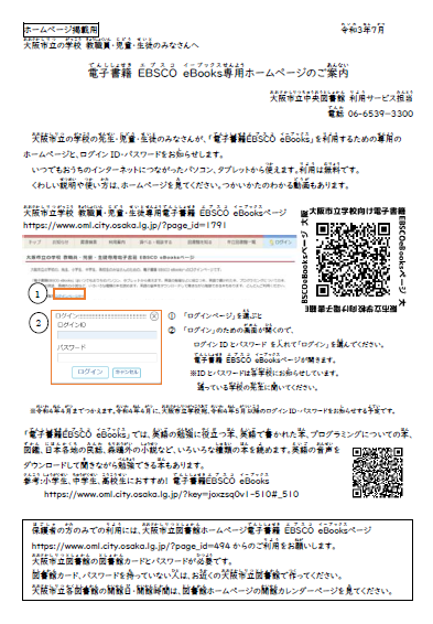 大阪市立の学校の先生・児童・生徒のみなさんが、「電子書籍EBSCO eBooks」を利用するための専用のホームページをお知らせします。