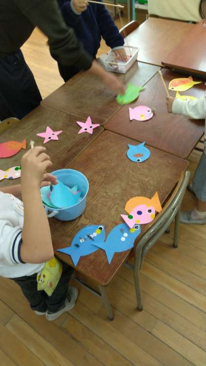 魚釣りゲームをしている場面にたずねました。互いに配慮し合い一緒に楽しむことを学んだり、手指の動作の訓練になったりします。また、釣り上げた魚の数を一緒に確認して数量感覚を養います。ゲームの後は、道具をきれいに後片付けします。