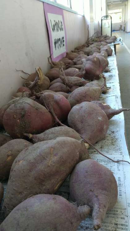 学習園のサツマイモを収穫し学年フロアーで風を当てています。どれも大きく育っていますね。