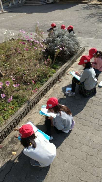2年生活科:校庭で見つけた秋をスケッチしていました。コスモスの花がきれいですね。