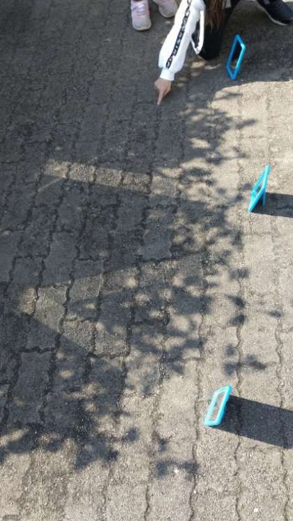 3年生理科:太陽の光を鏡ではね返したときの光の道すじを調べていました。鏡の角度をうまく調整して光で「M」の文字をうかばせていました。光が重なったところは明るいですね。
